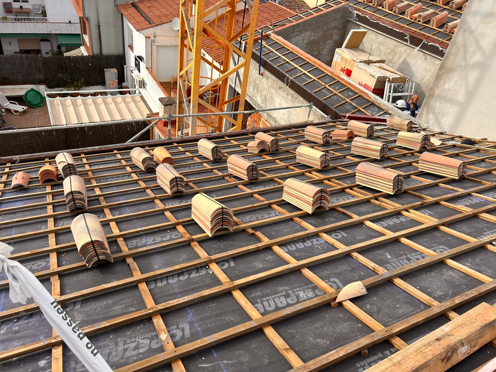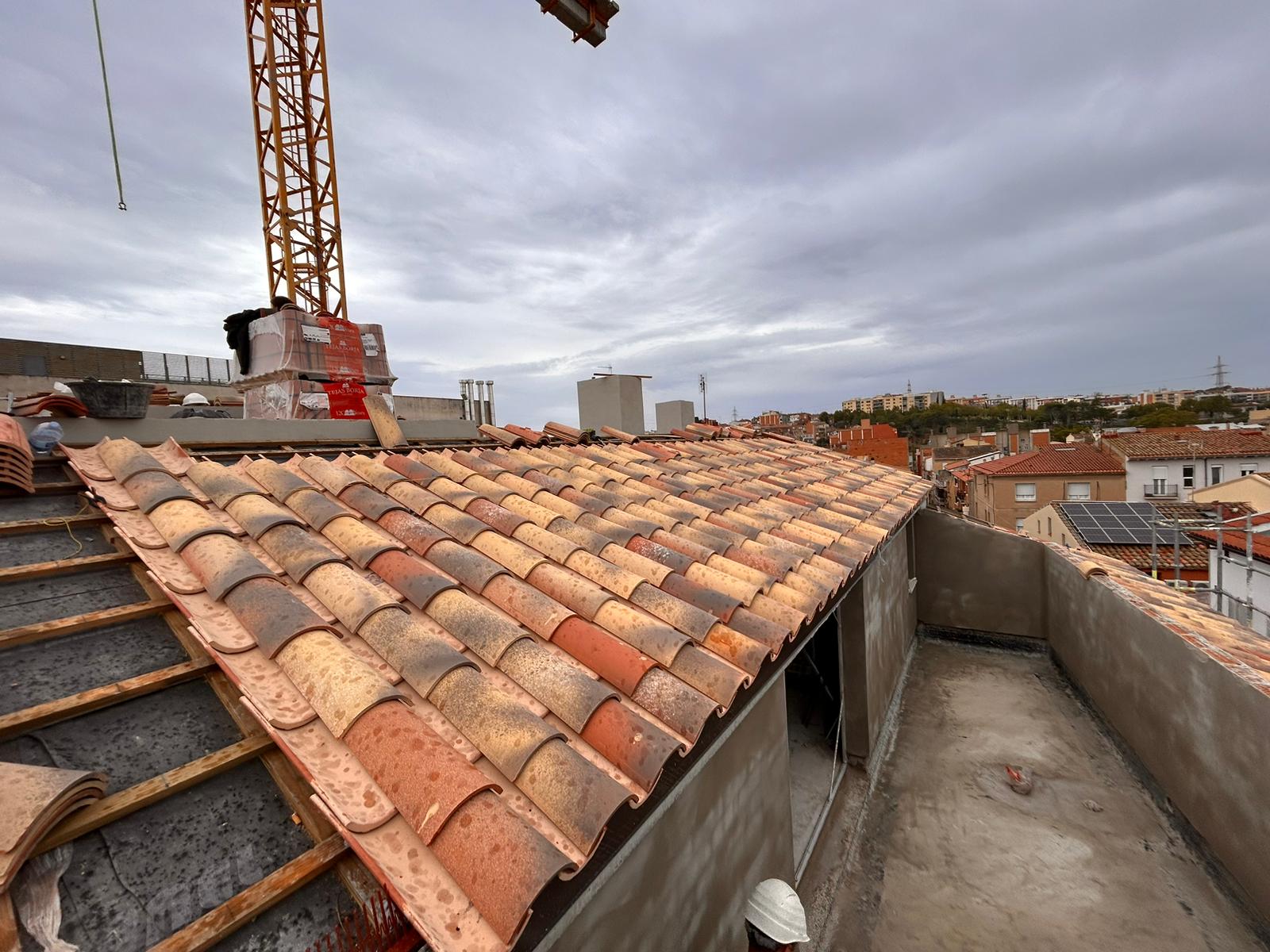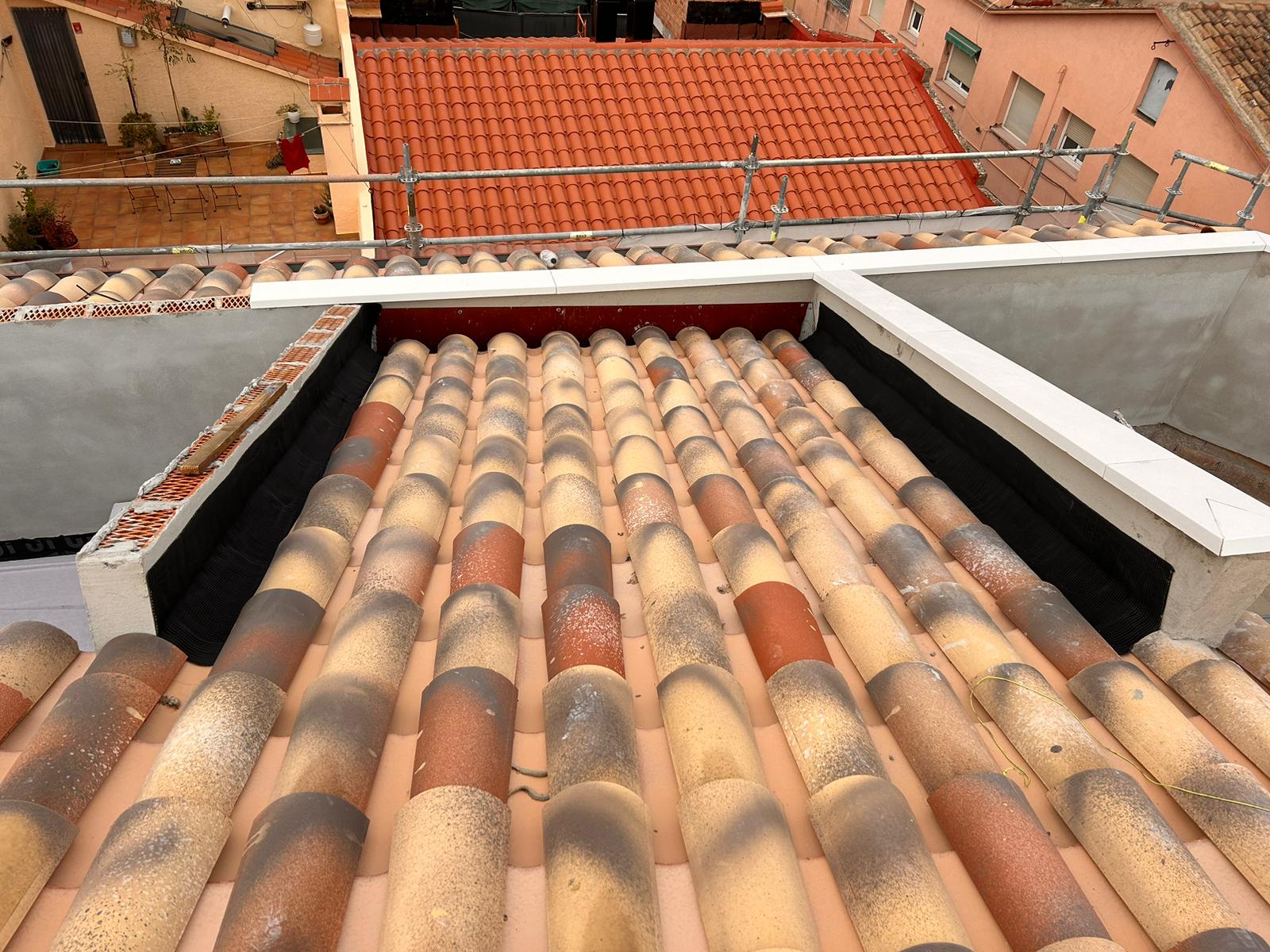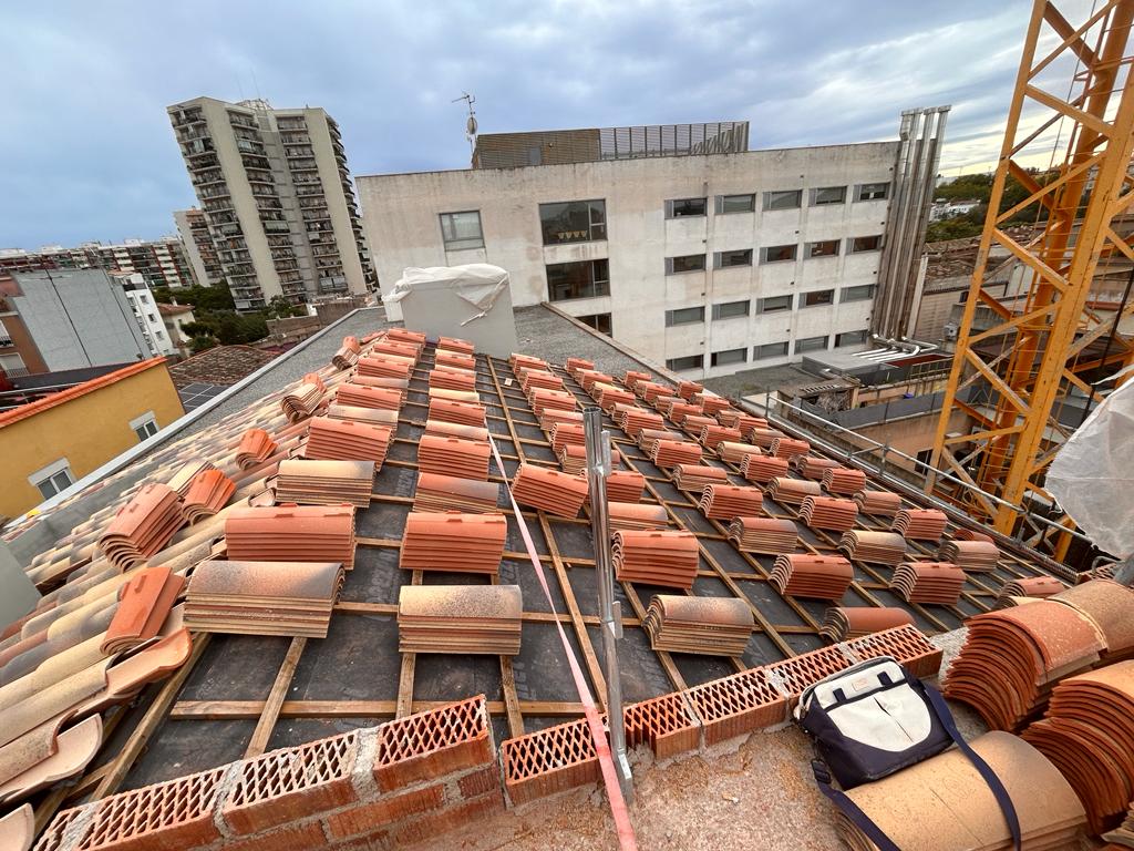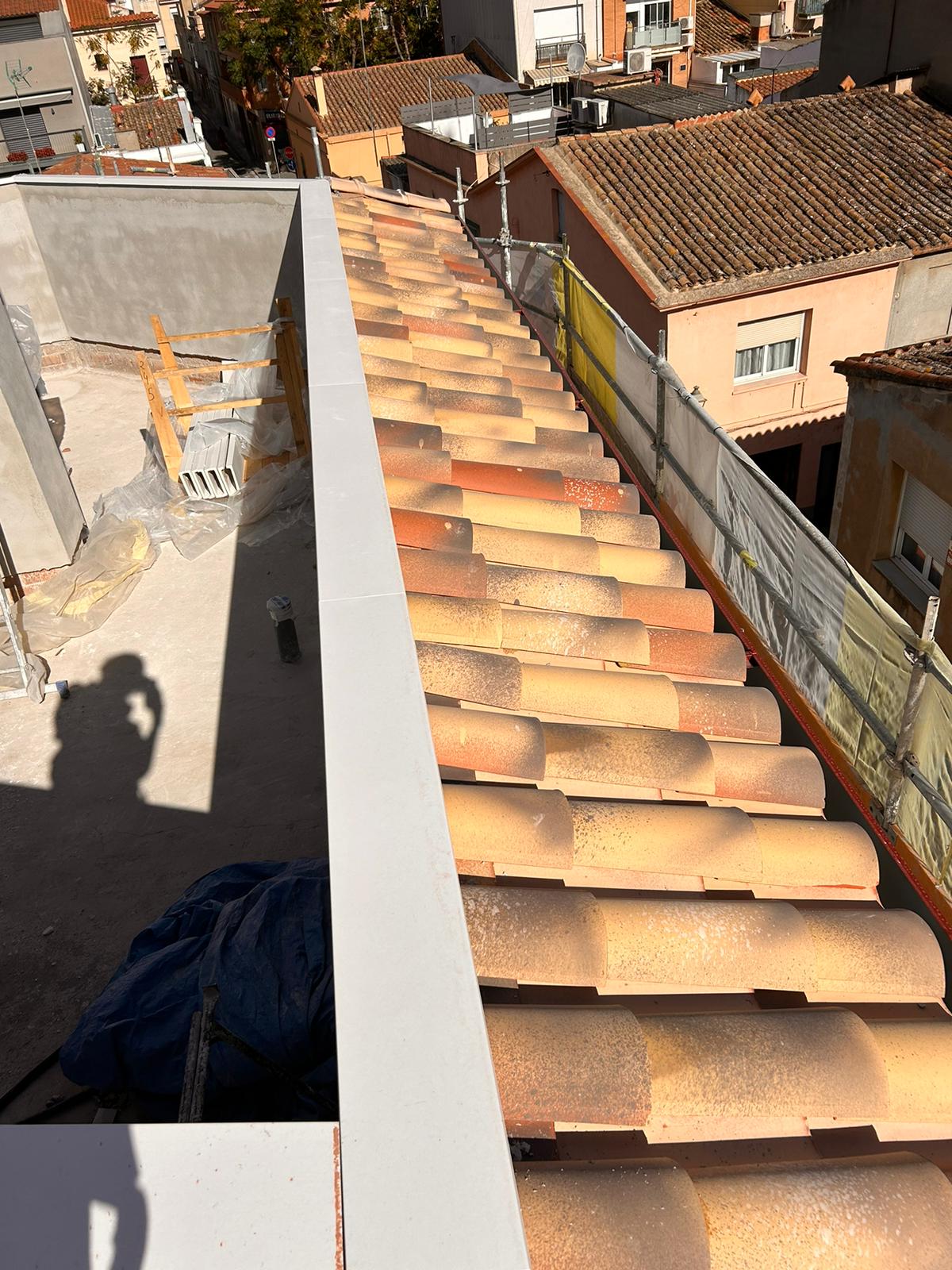 Cubierta de edificio plurifamiliar en Rubi, mediante sistema aislante, a base de panel de poliuretano y placa dm hidrófugo, lámina tyvek , doble rastrel de madera autoclave para crear la ventilación y final exterior, mediante teja árabe envejecida. En esta obra se cerró la misma en laterales y terrazas, con remates metálicos. Se colocó una canal exterior metálico colgada con forma cónica haciendo derivar los bajantes al interior de la finca.