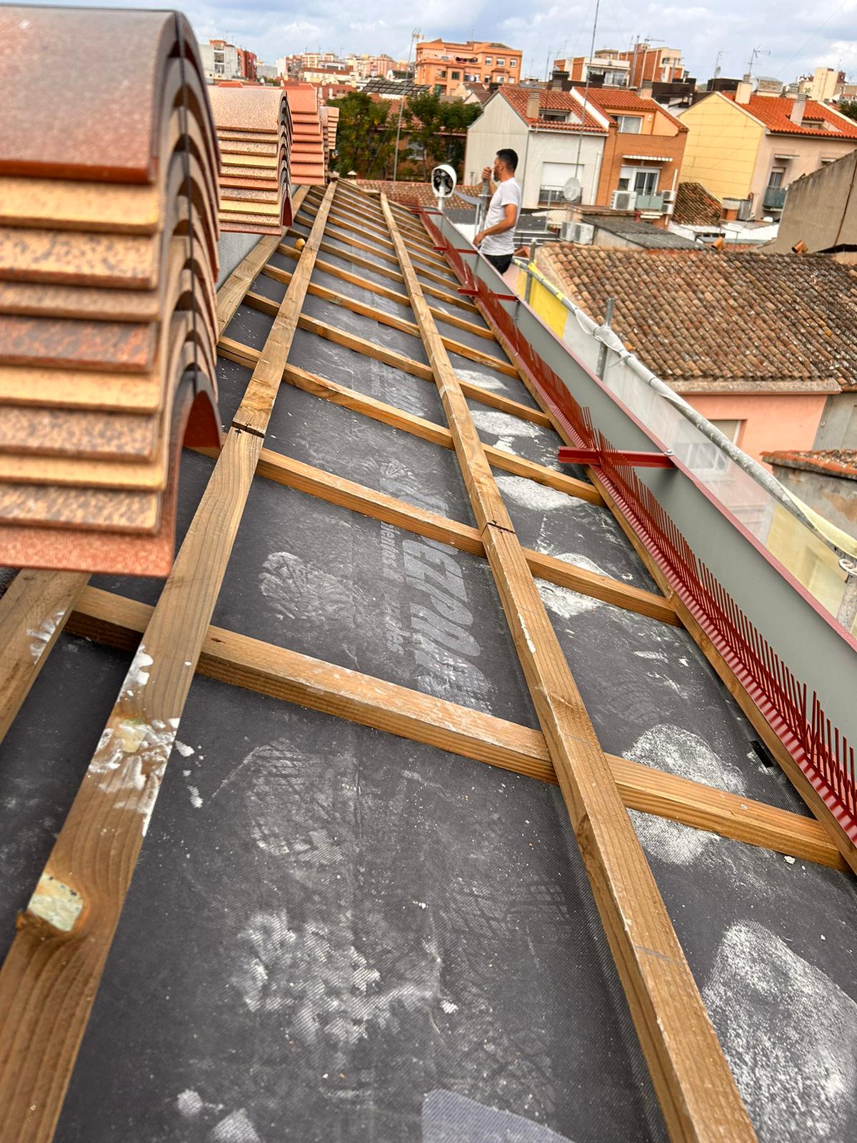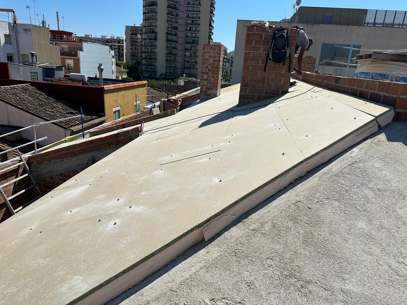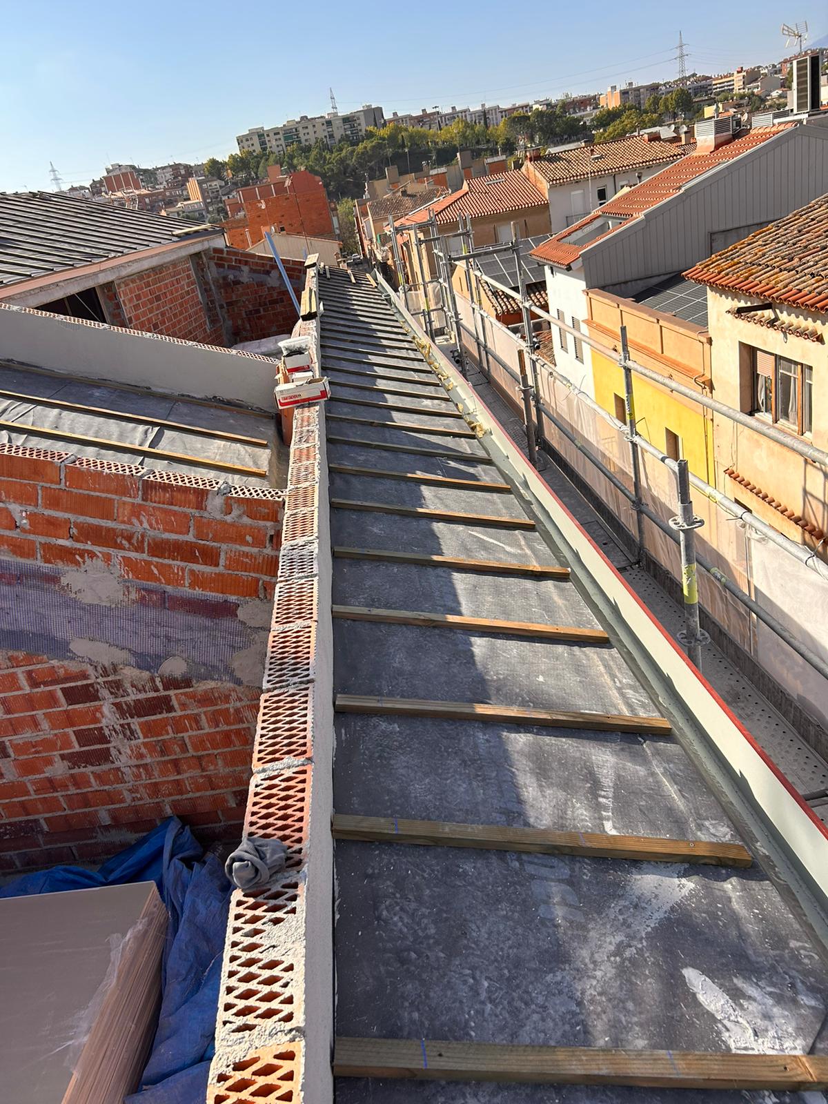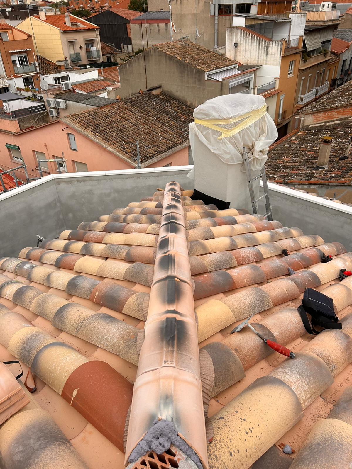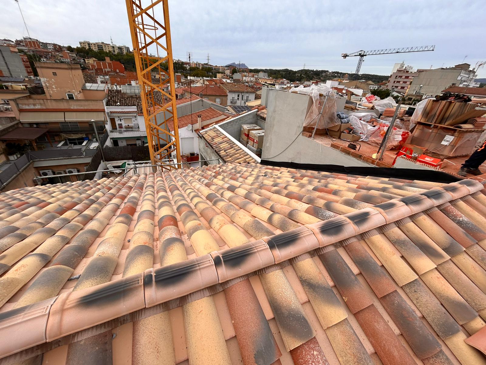 Cubierta de edificio plurifamiliar en Rubi, mediante sistema aislante, a base de panel de poliuretano y placa dm hidrófugo, lámina tyvek , doble rastrel de madera autoclave para crear la ventilación y final exterior, mediante teja árabe envejecida. En esta obra se cerró la misma en laterales y terrazas, con remates metálicos. Se colocó una canal exterior metálico colgada con forma cónica haciendo derivar los bajantes al interior de la finca.