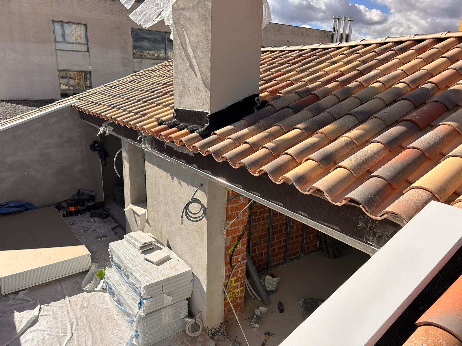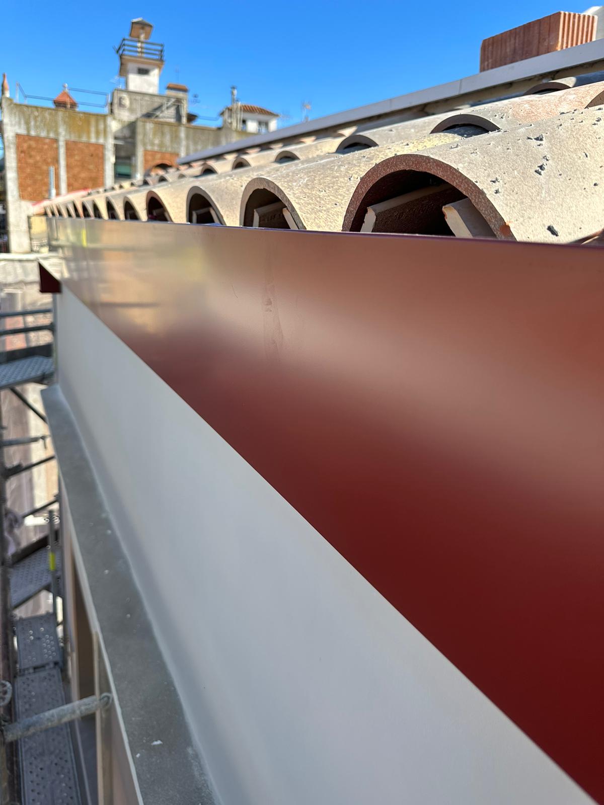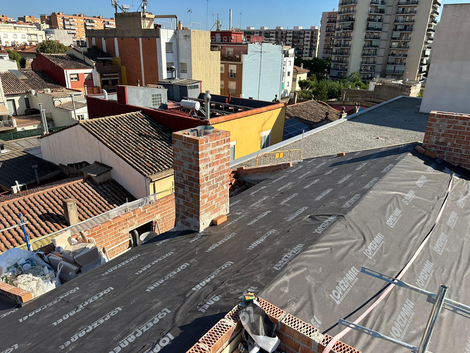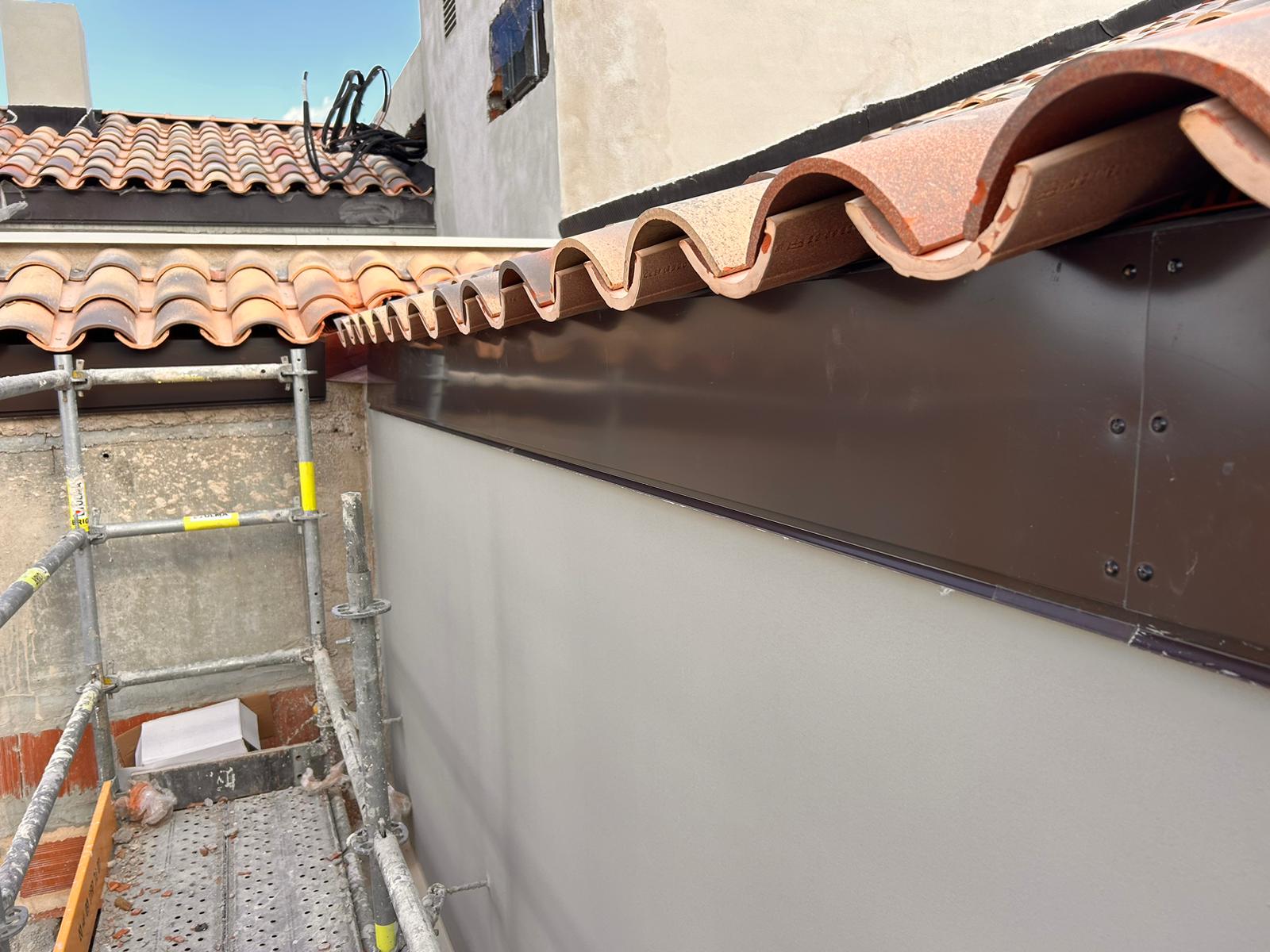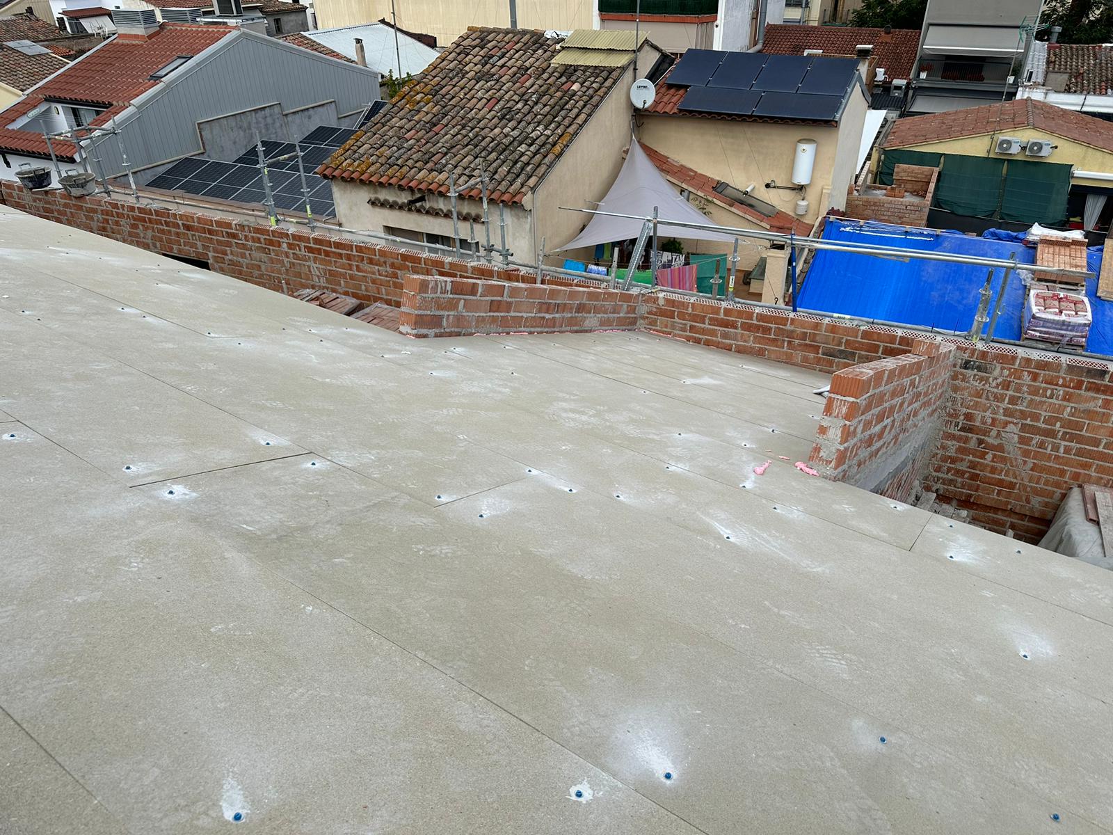 Cubierta de edificio plurifamiliar en Rubi, mediante sistema aislante, a base de panel de poliuretano y placa dm hidrófugo, lámina tyvek , doble rastrel de madera autoclave para crear la ventilación y final exterior, mediante teja árabe envejecida. En esta obra se cerró la misma en laterales y terrazas, con remates metálicos. Se colocó una canal exterior metálico colgada con forma cónica haciendo derivar los bajantes al interior de la finca.