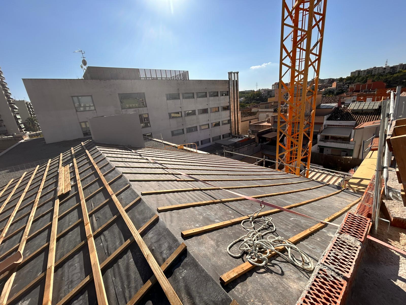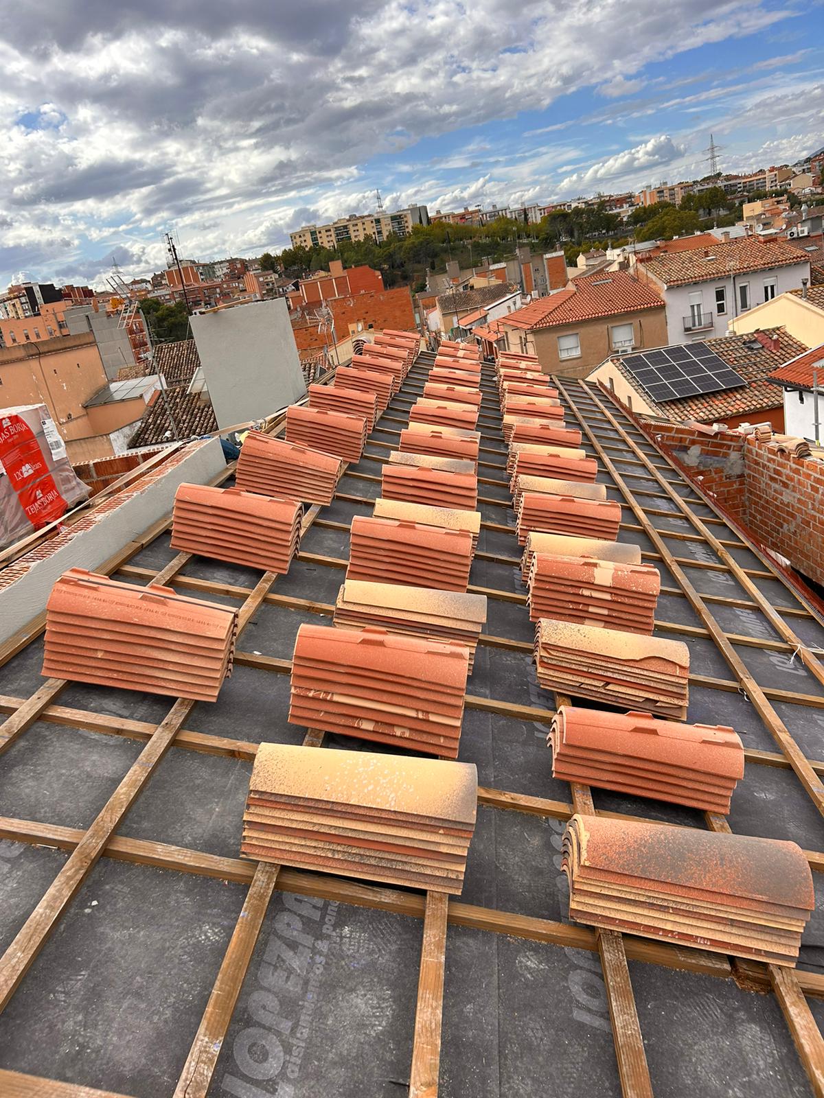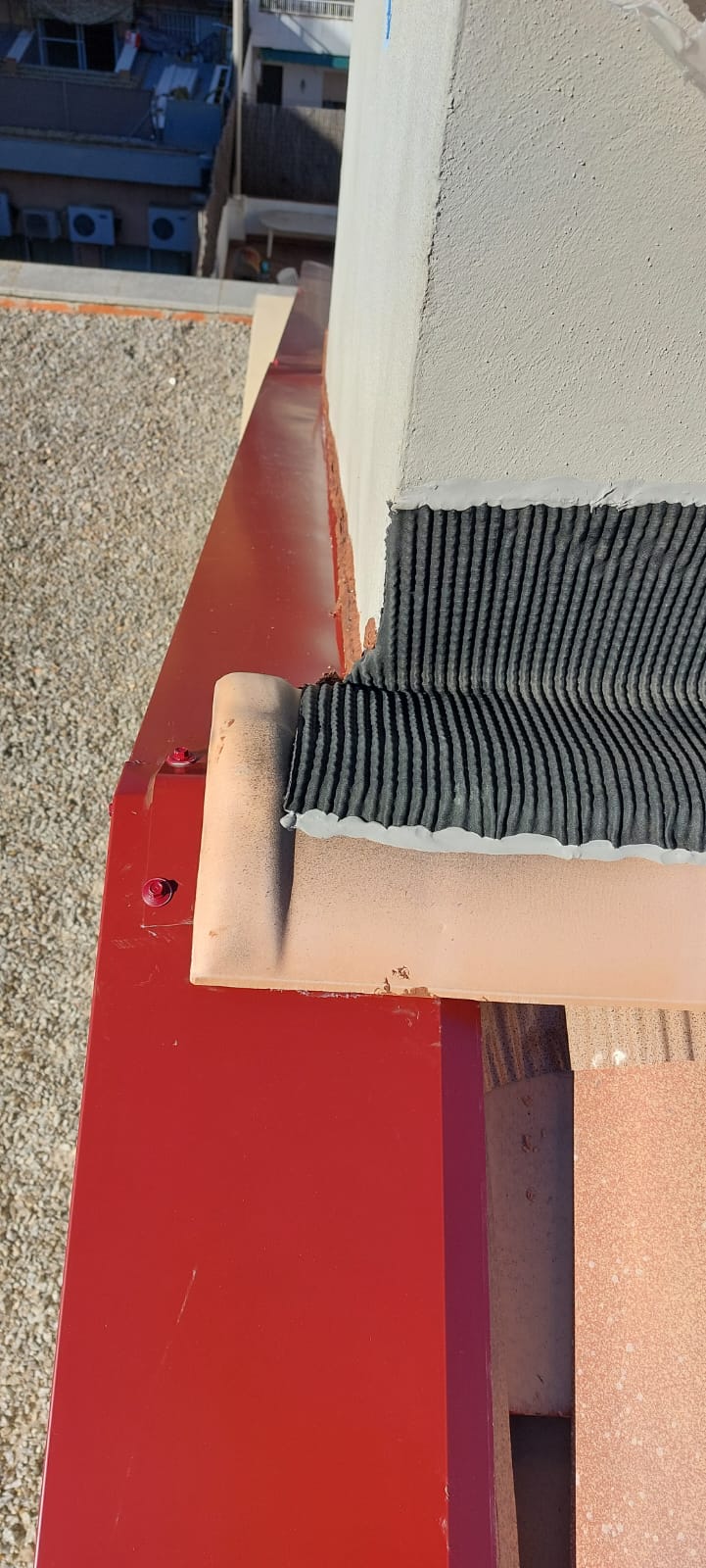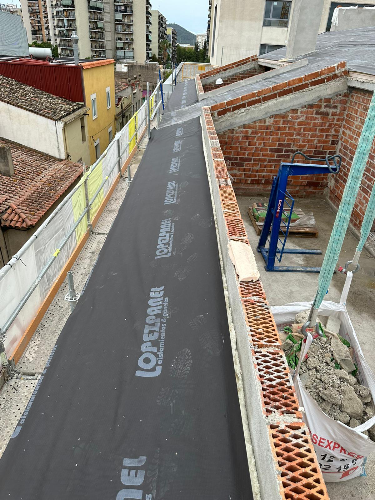 Cubierta de edificio plurifamiliar en Rubi, mediante sistema aislante, a base de panel de poliuretano y placa dm hidrófugo, lámina tyvek , doble rastrel de madera autoclave para crear la ventilación y final exterior, mediante teja árabe envejecida. En esta obra se cerró la misma en laterales y terrazas, con remates metálicos. Se colocó una canal exterior metálico colgada con forma cónica haciendo derivar los bajantes al interior de la finca.