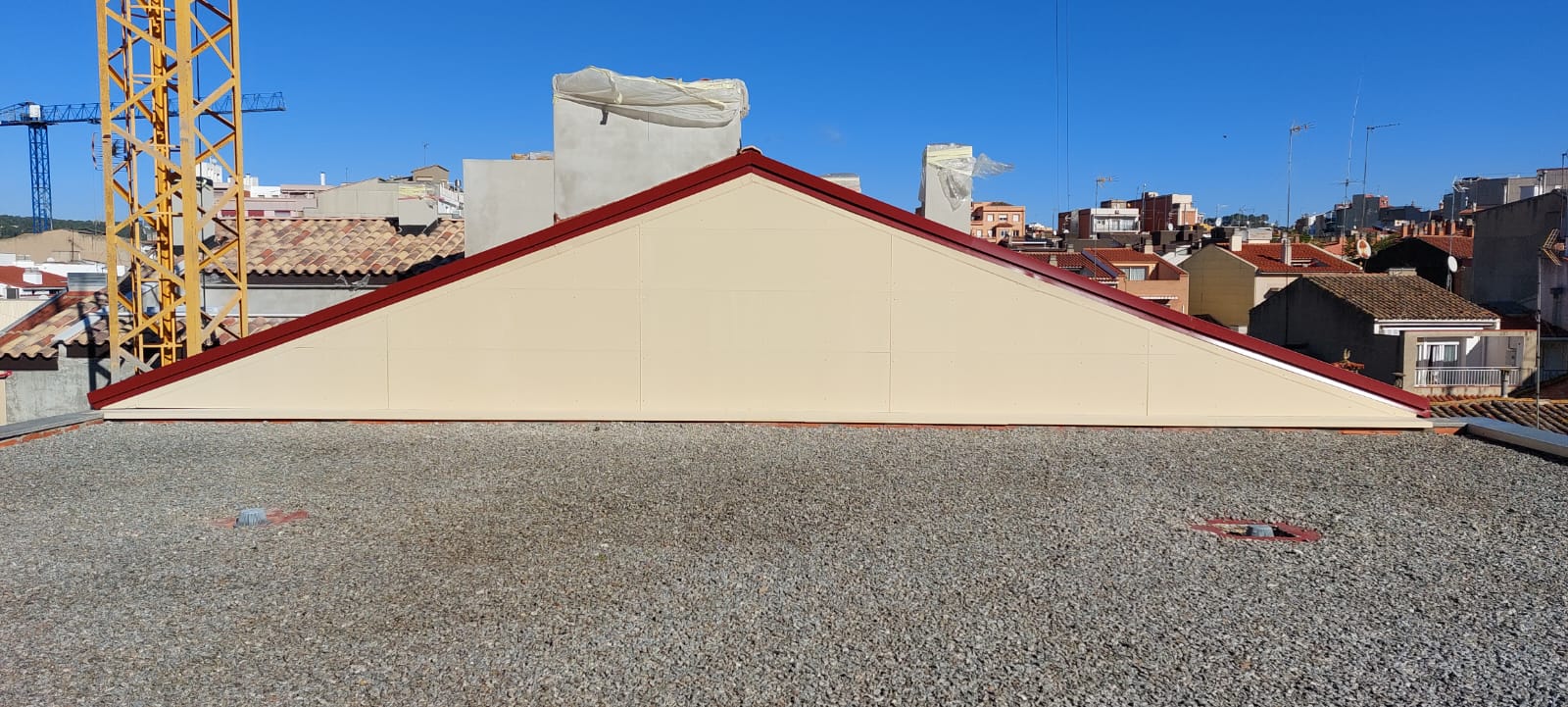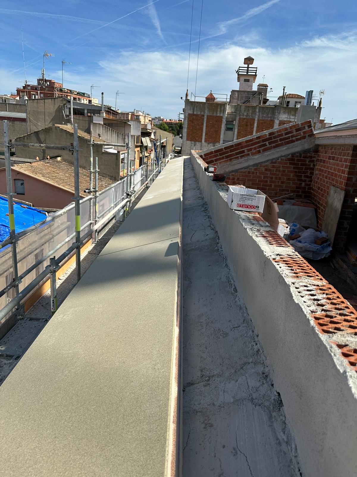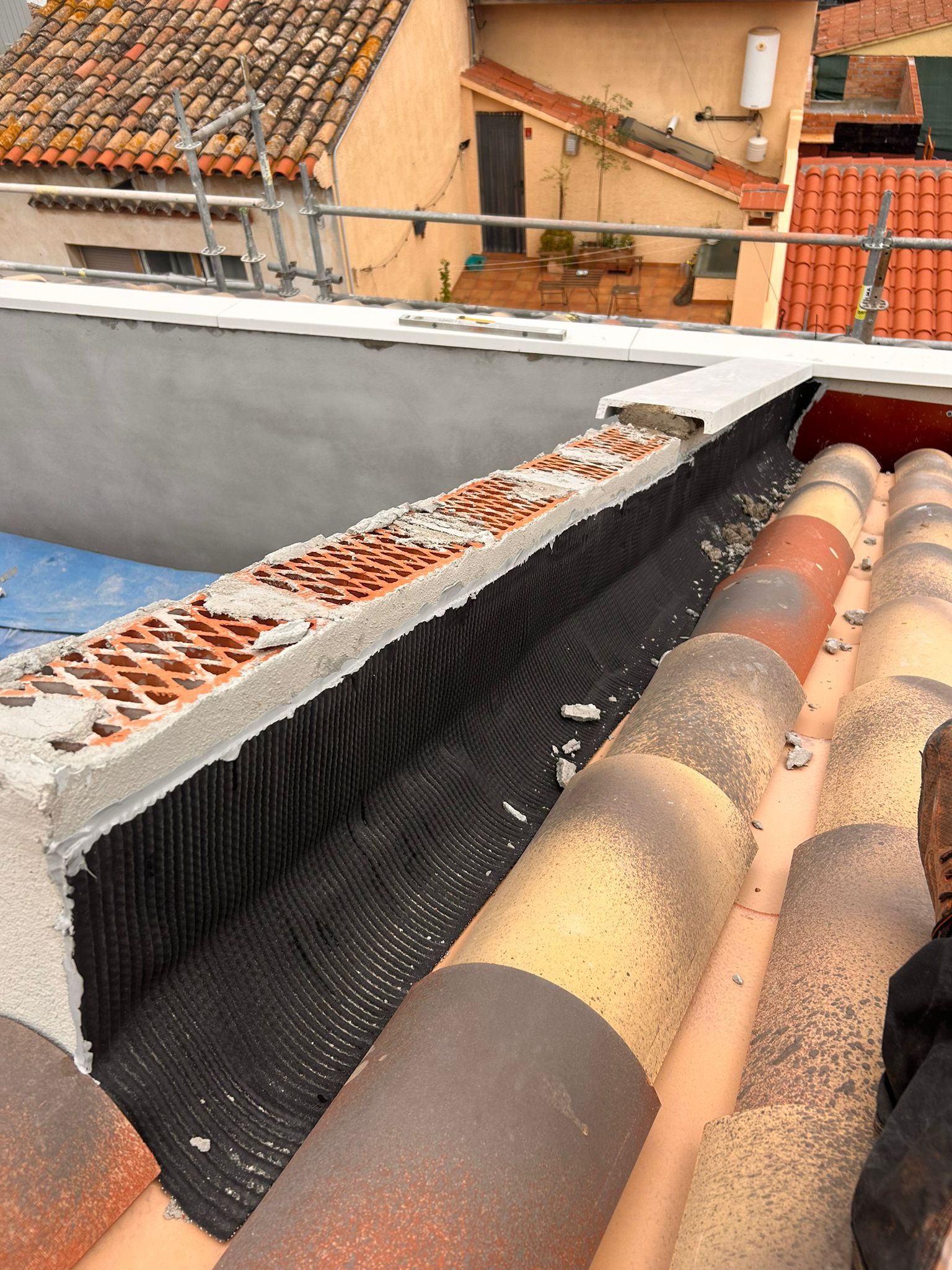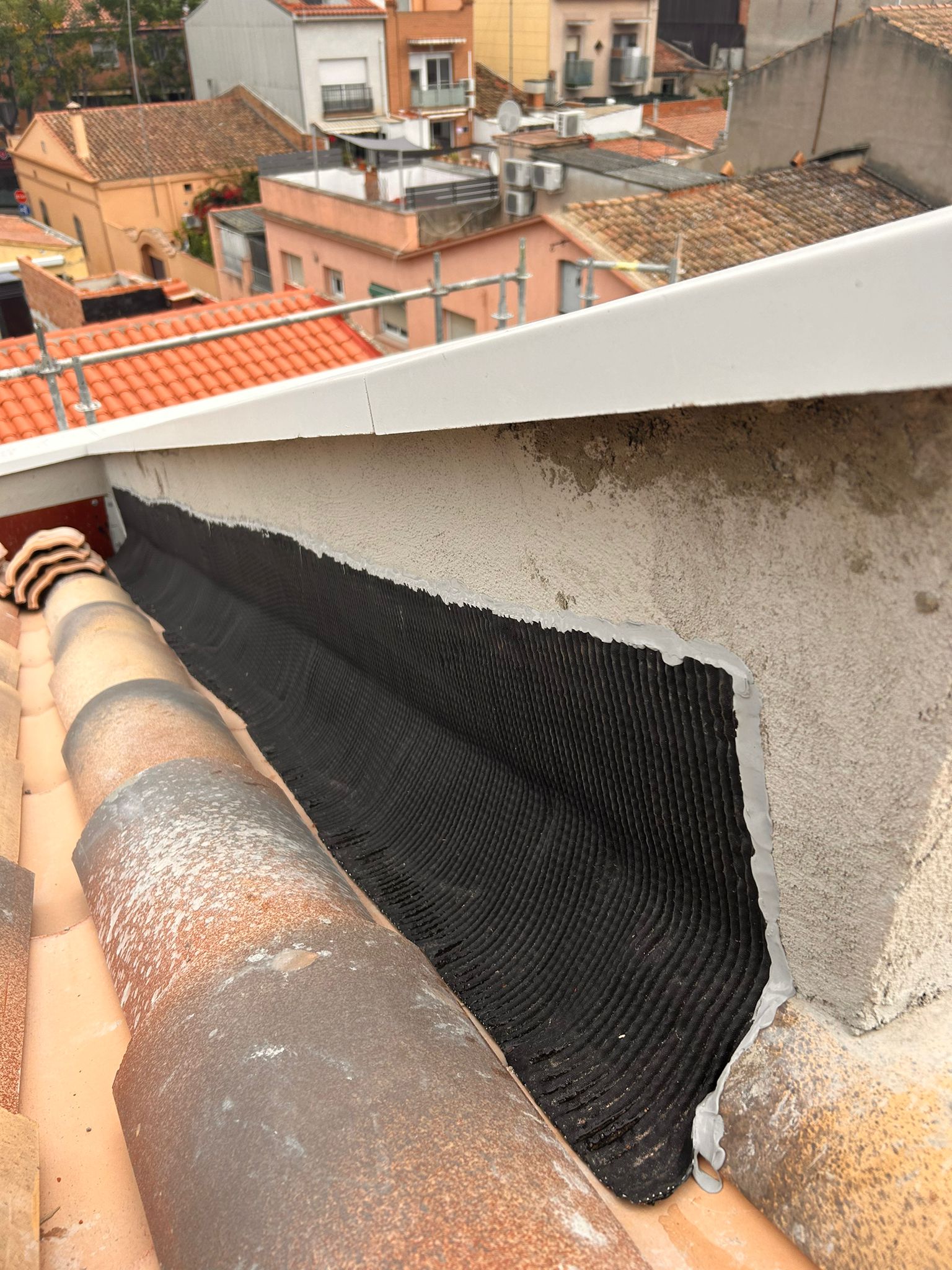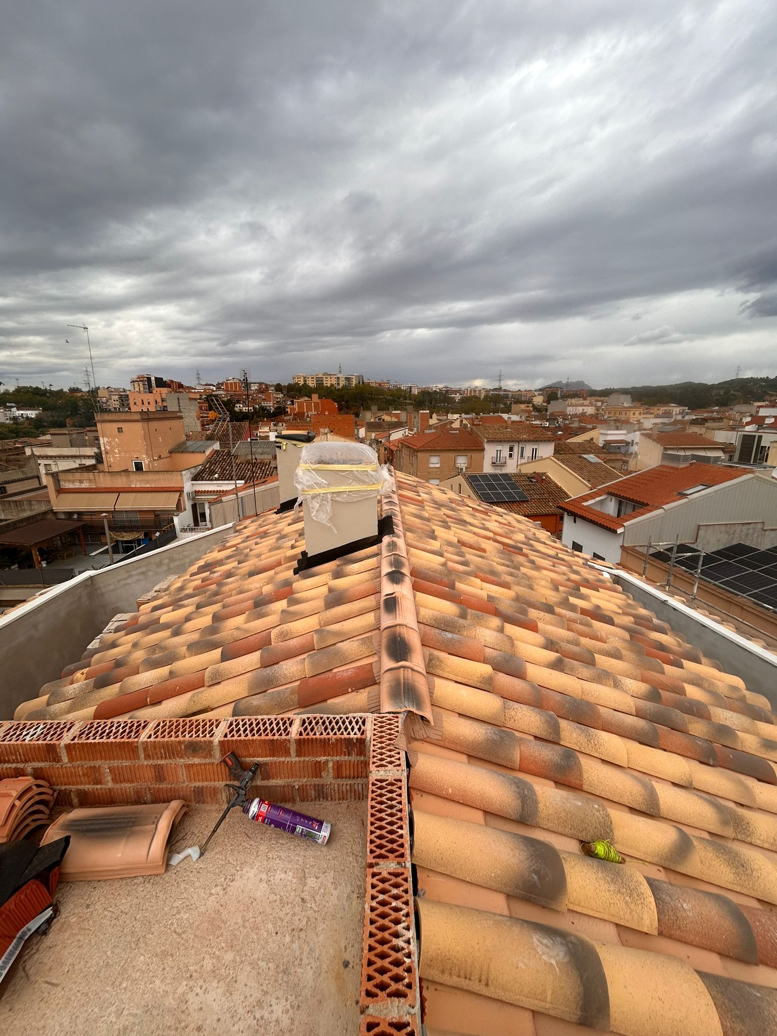 Cubierta de edificio plurifamiliar en Rubi, mediante sistema aislante, a base de panel de poliuretano y placa dm hidrófugo, lámina tyvek , doble rastrel de madera autoclave para crear la ventilación y final exterior, mediante teja árabe envejecida. En esta obra se cerró la misma en laterales y terrazas, con remates metálicos. Se colocó una canal exterior metálico colgada con forma cónica haciendo derivar los bajantes al interior de la finca.