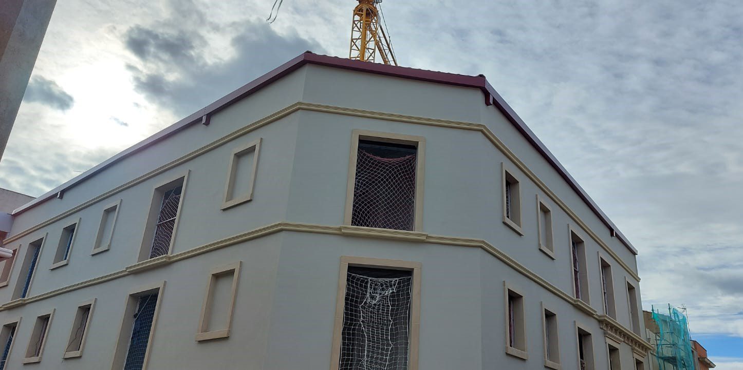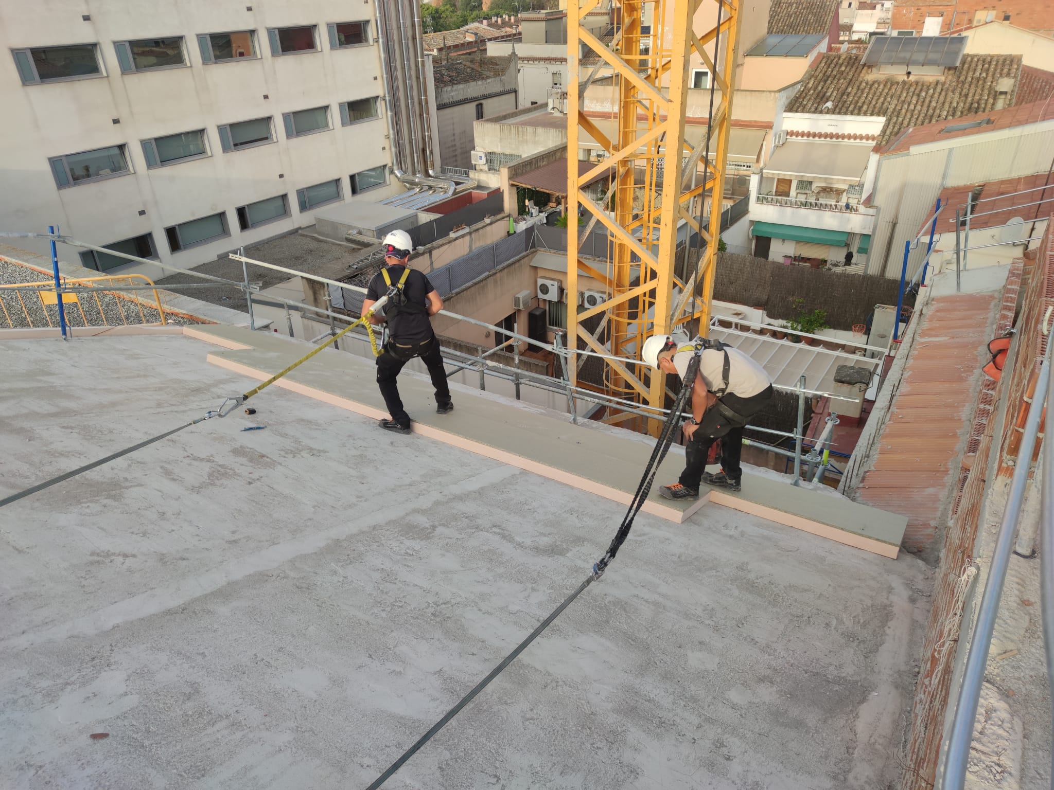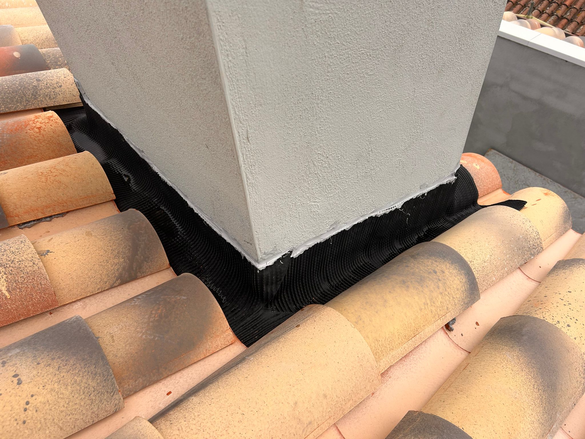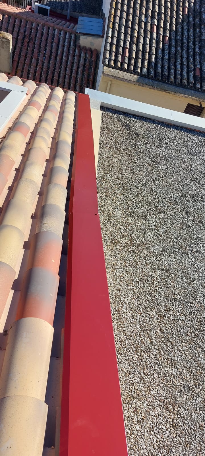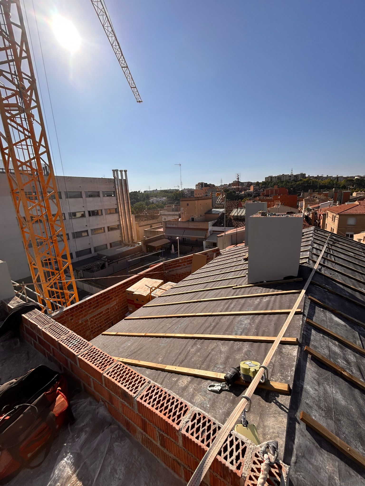 Cubierta de edificio plurifamiliar en Rubi, mediante sistema aislante, a base de panel de poliuretano y placa dm hidrófugo, lámina tyvek , doble rastrel de madera autoclave para crear la ventilación y final exterior, mediante teja árabe envejecida. En esta obra se cerró la misma en laterales y terrazas, con remates metálicos. Se colocó una canal exterior metálico colgada con forma cónica haciendo derivar los bajantes al interior de la finca.