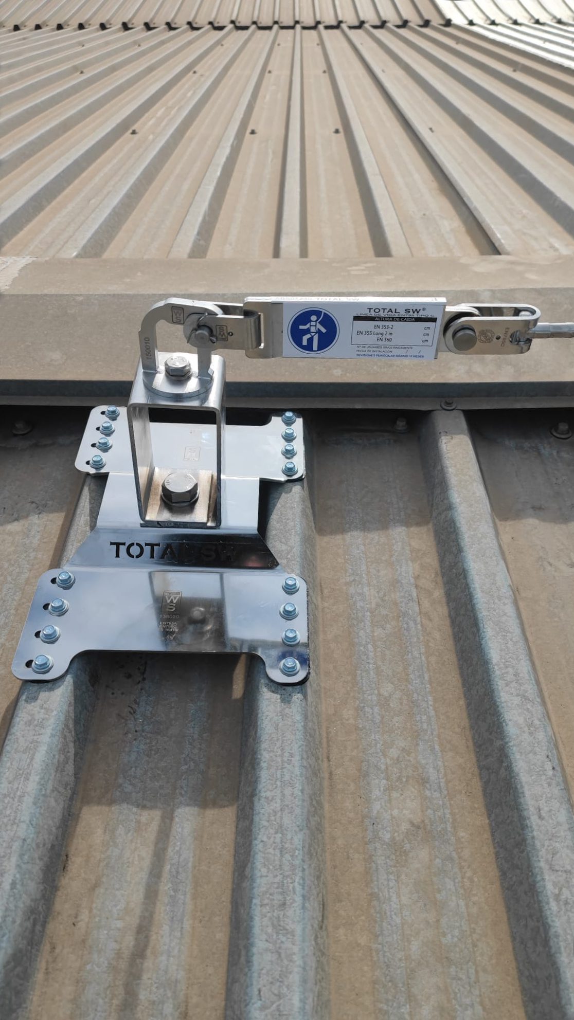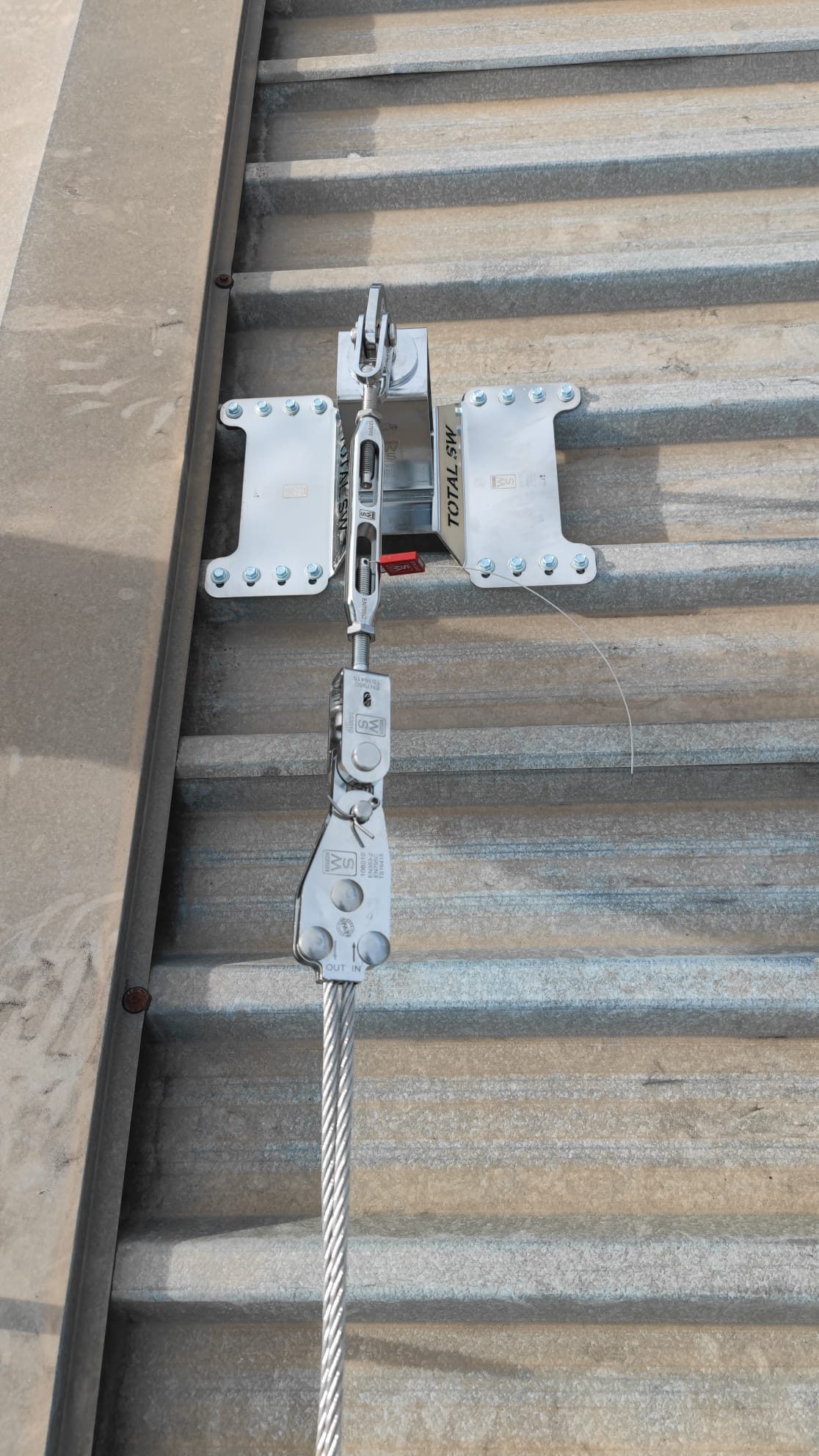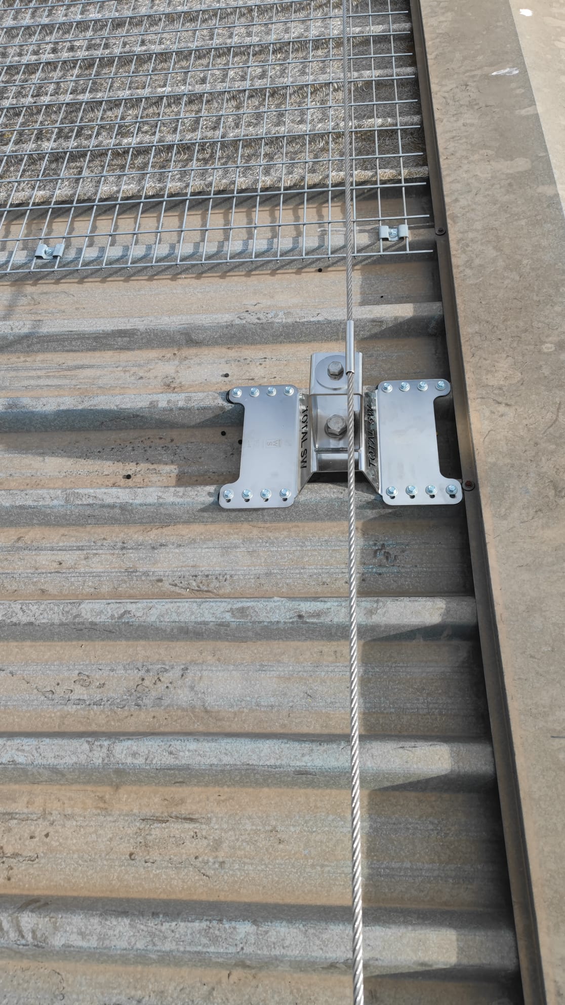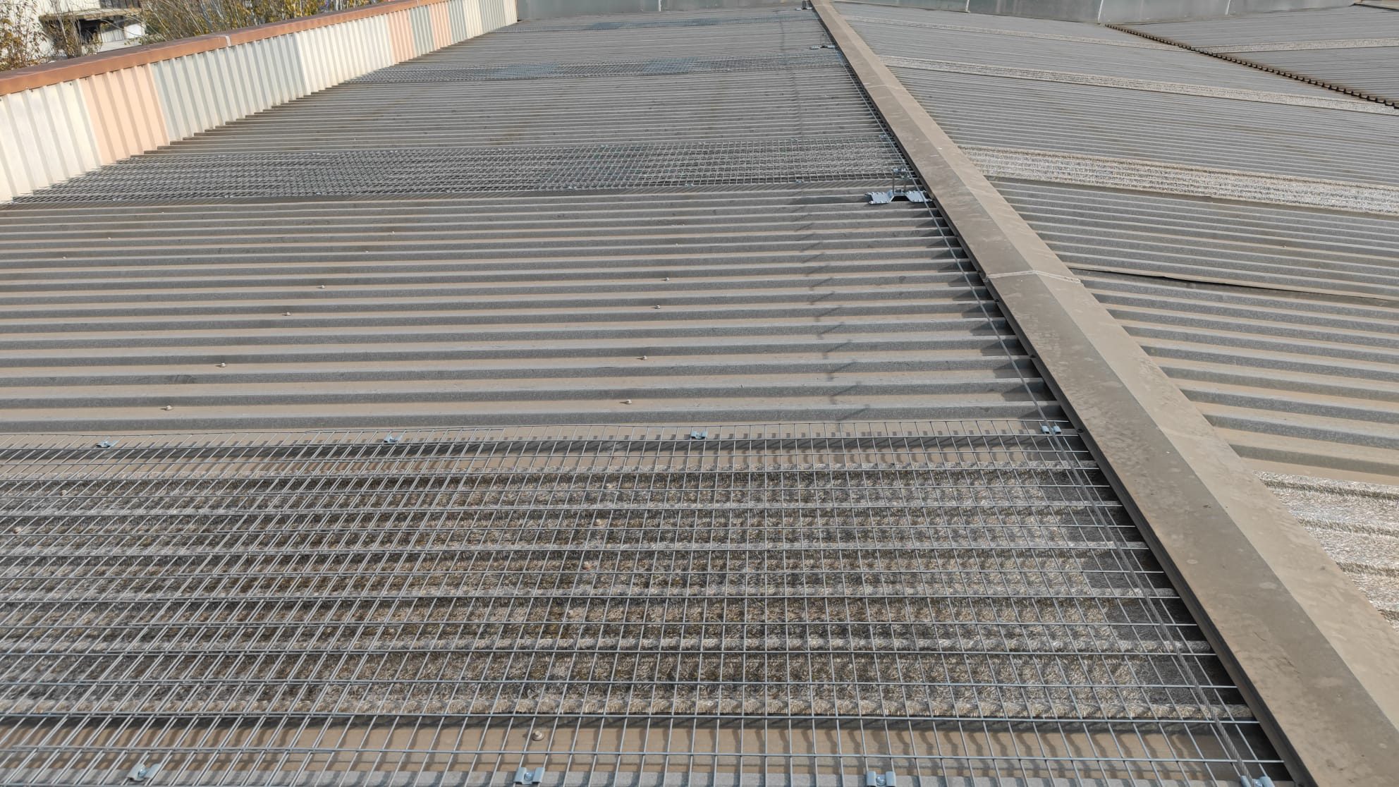 Colocación de seguridad en obra, línea de vida definitiva Inox y mallas electrosoldadas de seguridad sobre los lucernarios existentes.