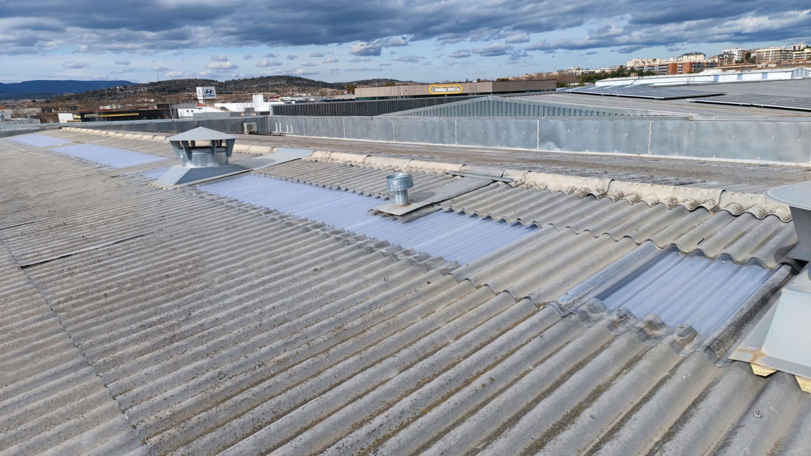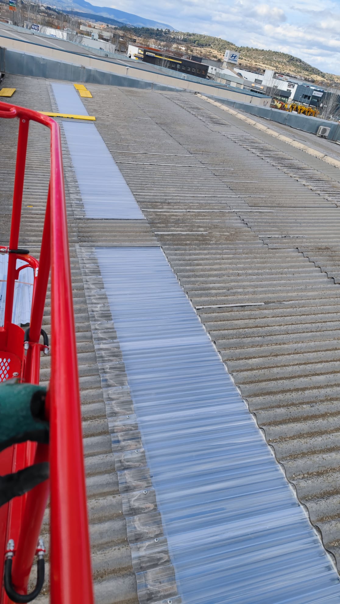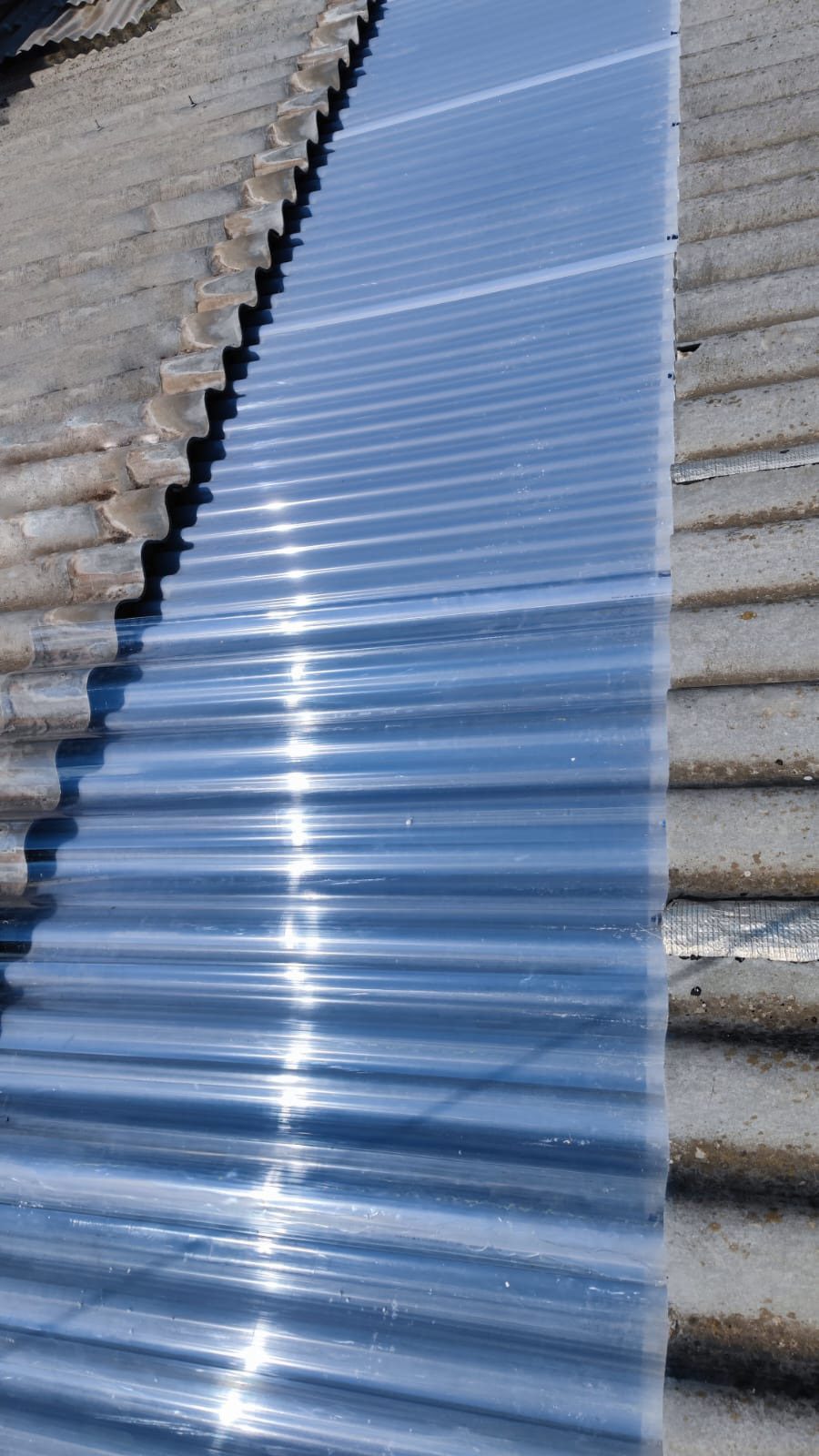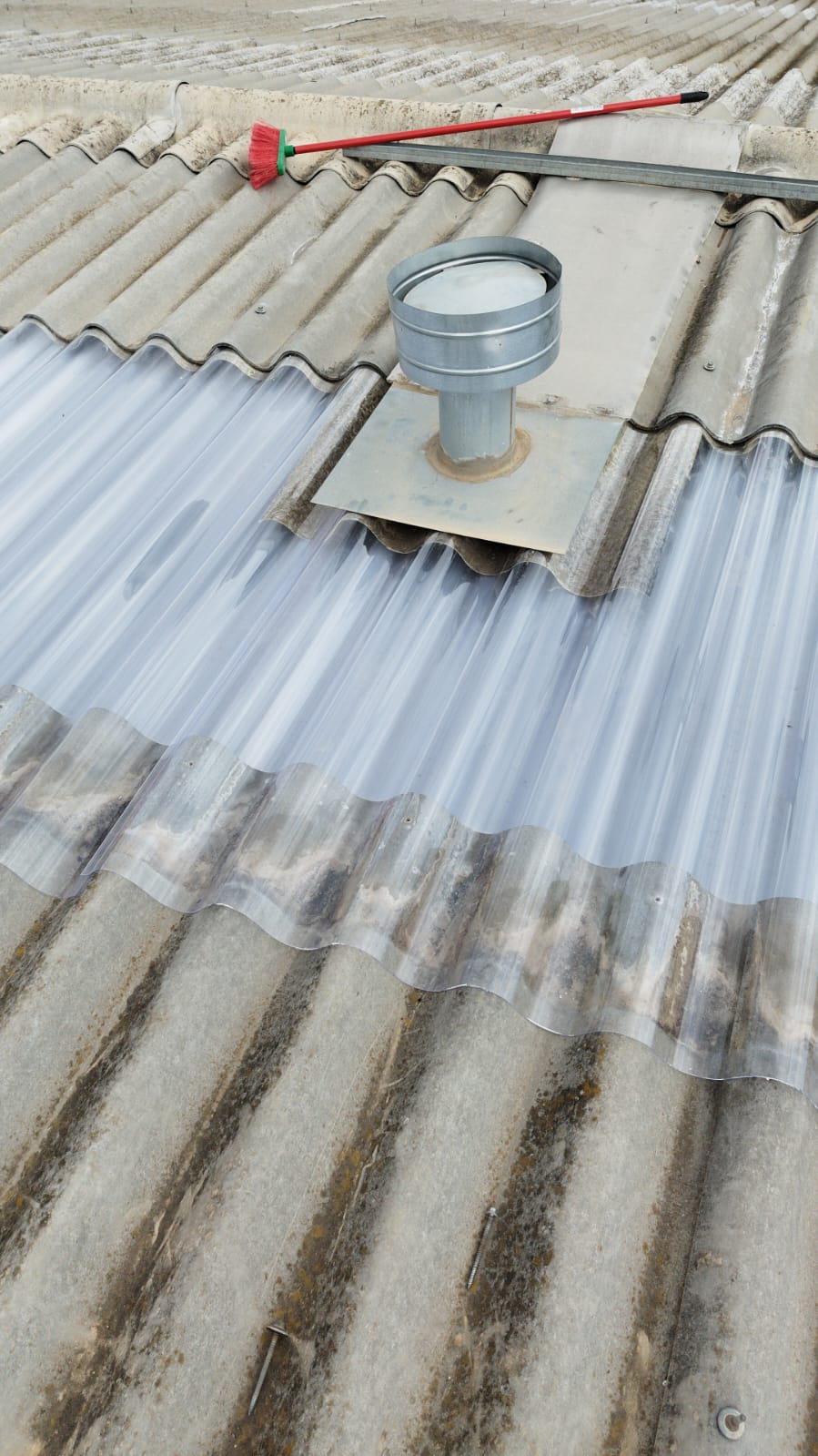 Retirada por medios manuales de lucernarios de poliéster en cubierta, 2 capas superior modelo gran onda e inferior modelo mini honda. Nueva colocación en los huecos existentes de policarbonato compacto mismos perfiles de los desmontados, pero de 1mm de espesor, sellado con silicona neutra entre las nuevas placas y limpieza de la zona anexa de trabajo.