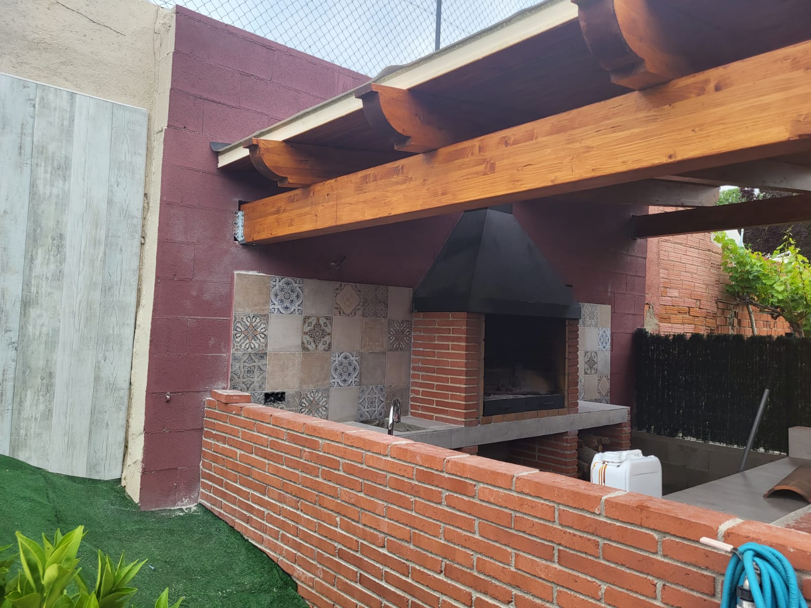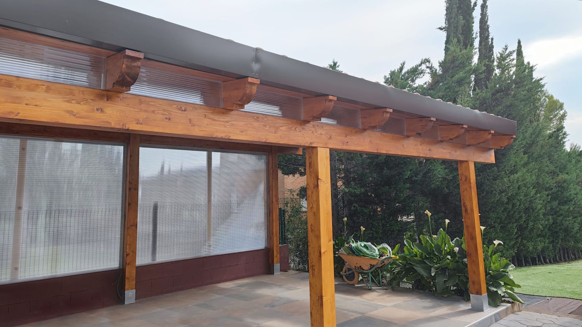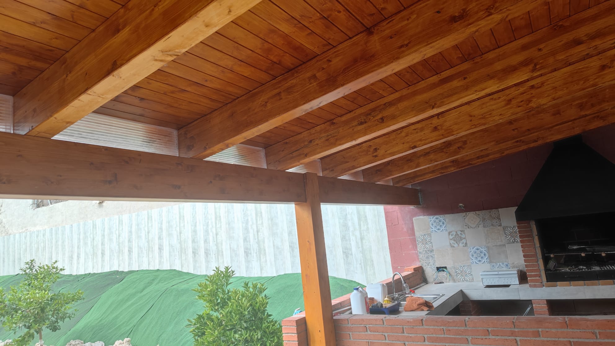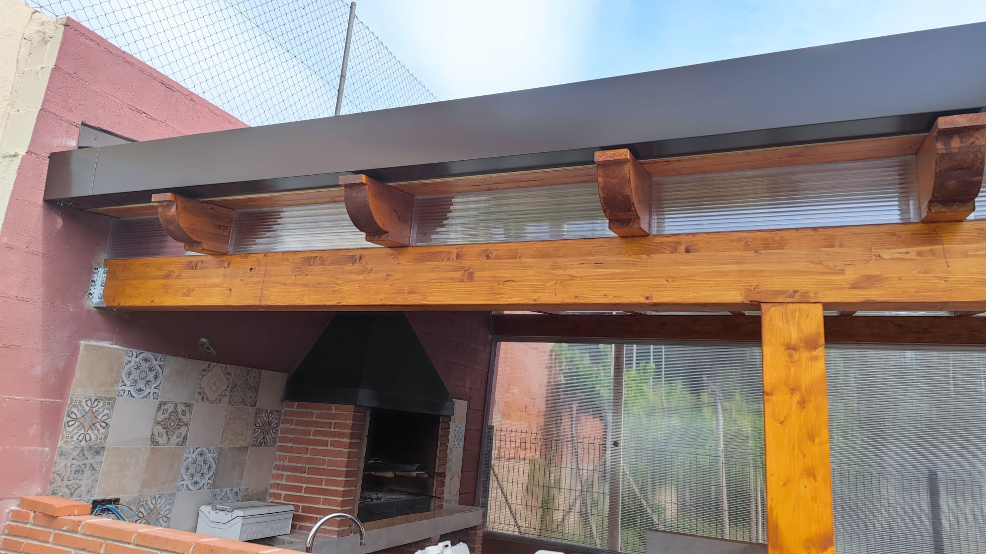 Nueva pérgola de madera en obra , para cierre de cocina exterior y barbacoa, compuesta por, estructura de madera portante, panel superior aislante, doble rastrel de madera, teja curva envejecida y cierre del conjunto con remates prelacados y canal. Se cerró también toda la parte trasera con policarbonato celular de 16mm y remates perimetrales, para resguardar del aire la estancia.