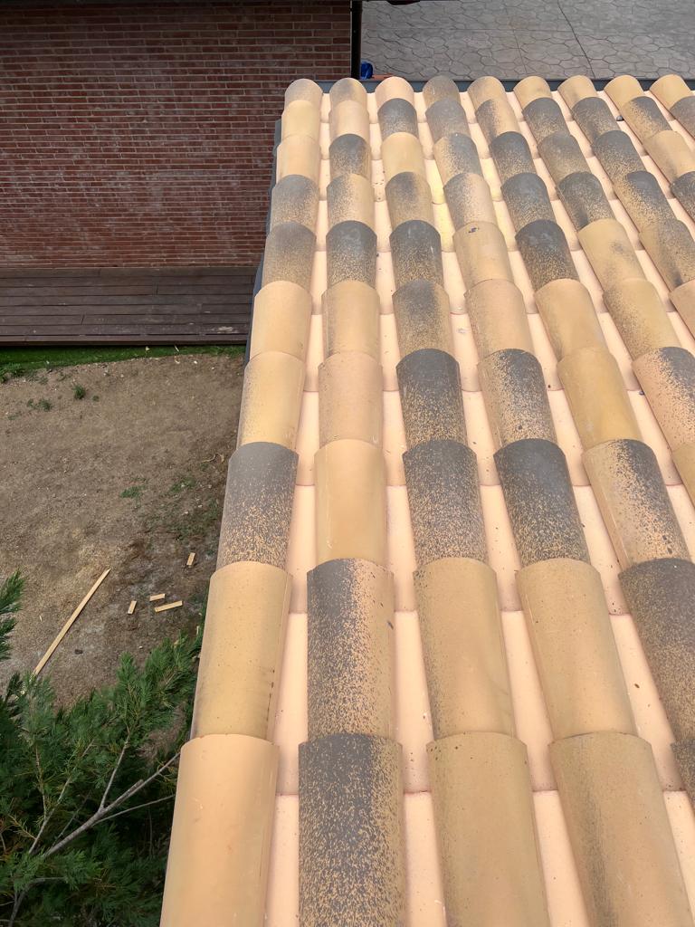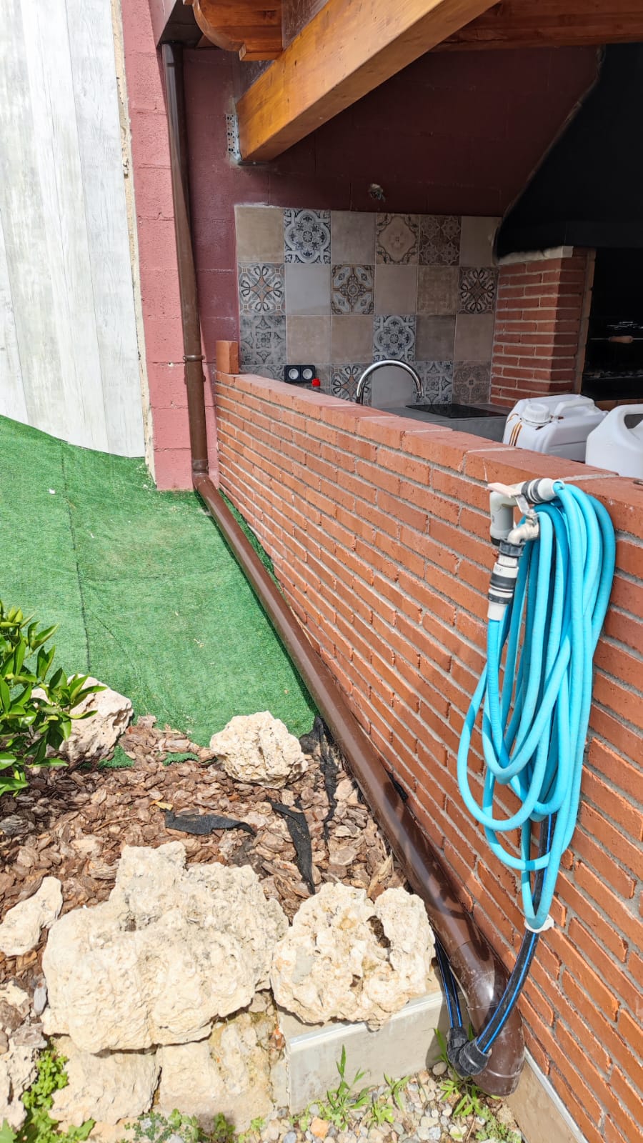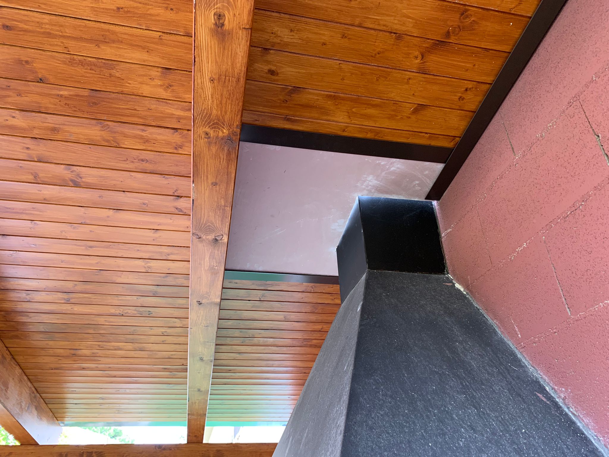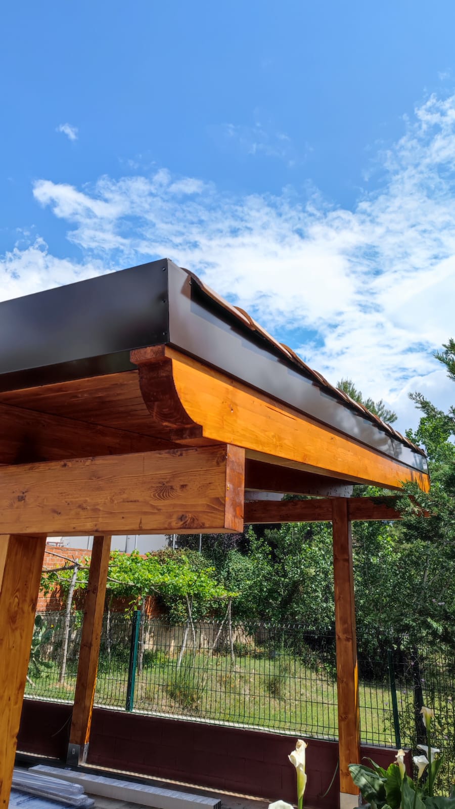 Nueva pérgola de madera en obra , para cierre de cocina exterior y barbacoa, compuesta por, estructura de madera portante, panel superior aislante, doble rastrel de madera, teja curva envejecida y cierre del conjunto con remates prelacados y canal. Se cerró también toda la parte trasera con policarbonato celular de 16mm y remates perimetrales, para resguardar del aire la estancia.
