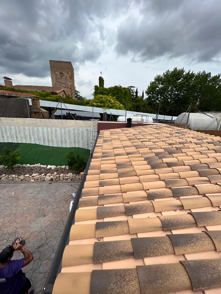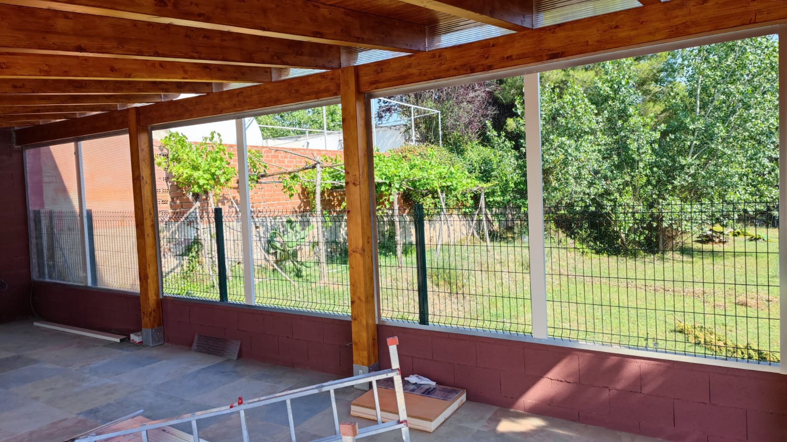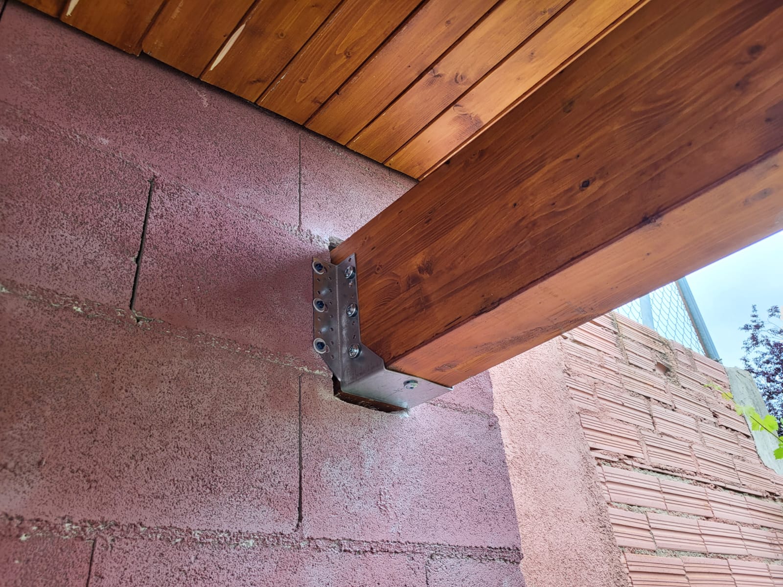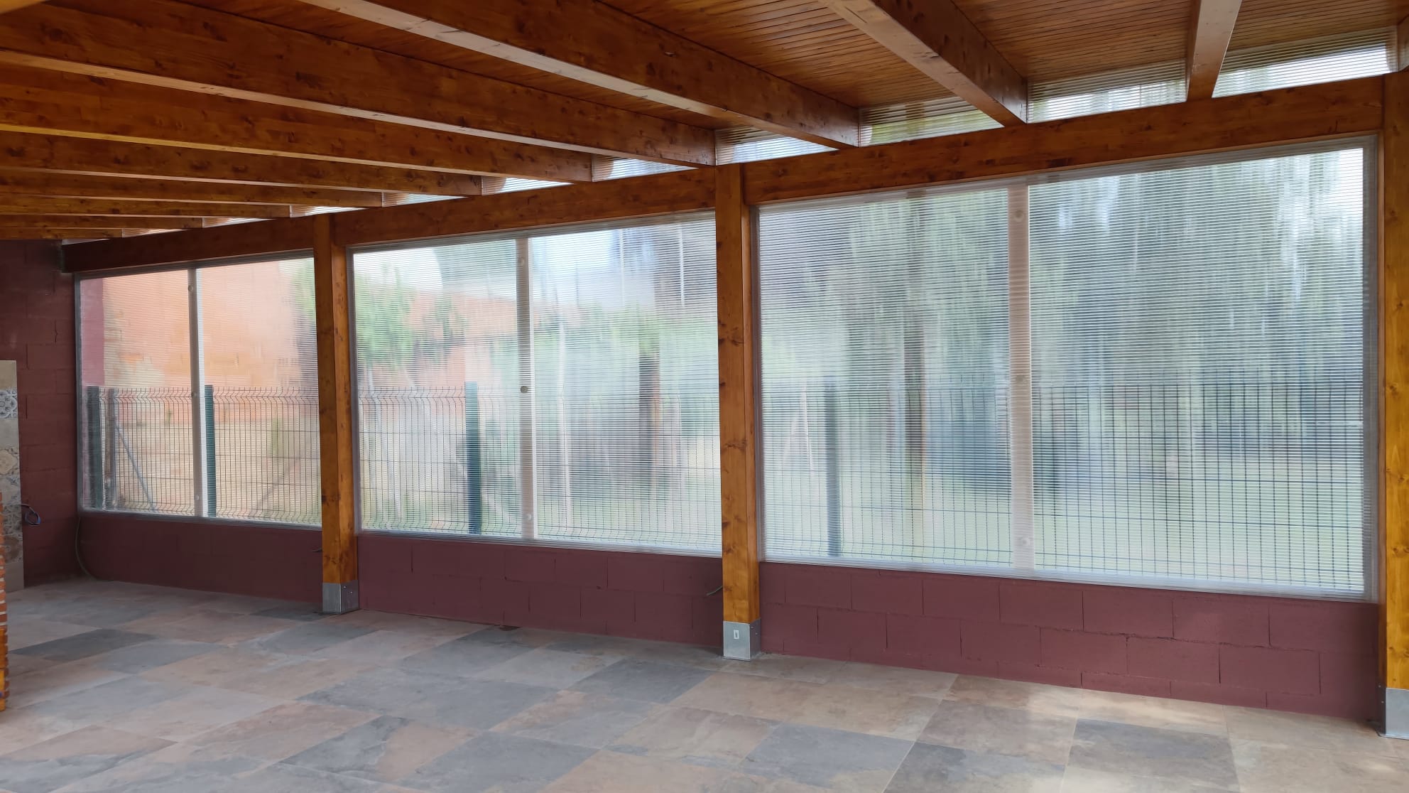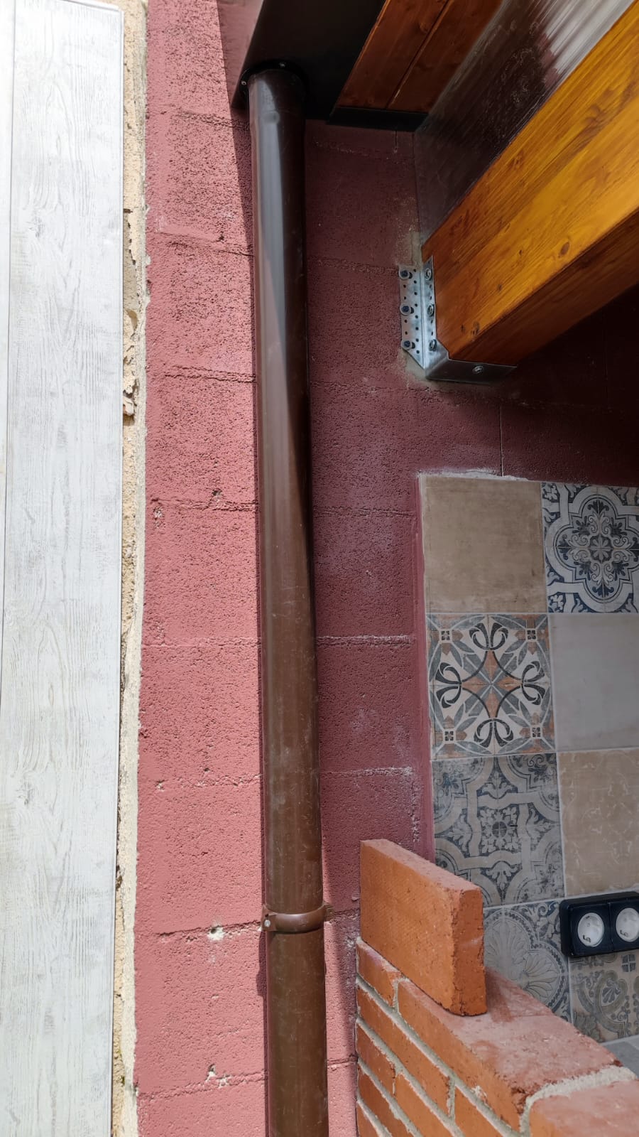 Nueva pérgola de madera en obra , para cierre de cocina exterior y barbacoa, compuesta por, estructura de madera portante, panel superior aislante, doble rastrel de madera, teja curva envejecida y cierre del conjunto con remates prelacados y canal. Se cerró también toda la parte trasera con policarbonato celular de 16mm y remates perimetrales, para resguardar del aire la estancia.
