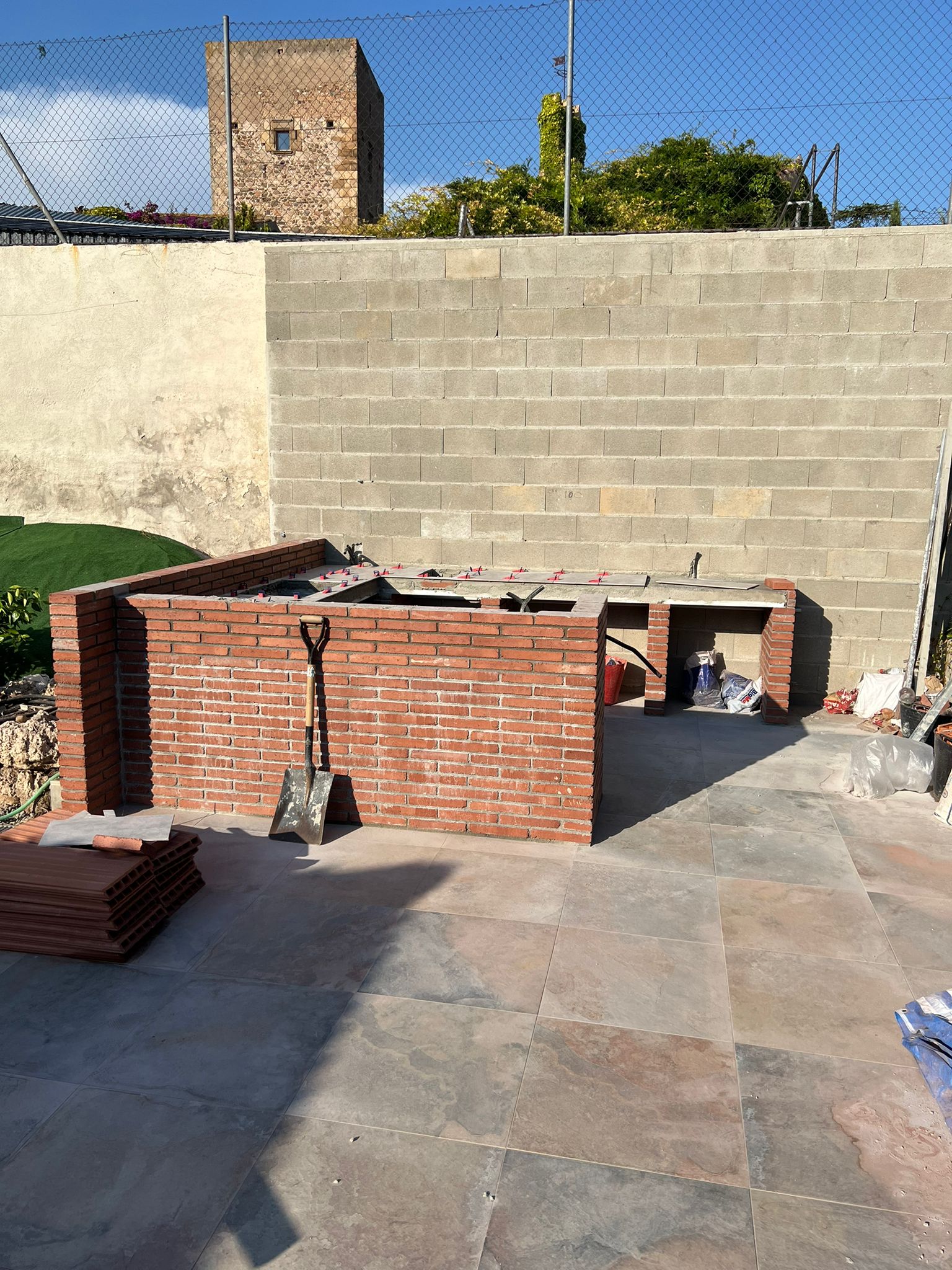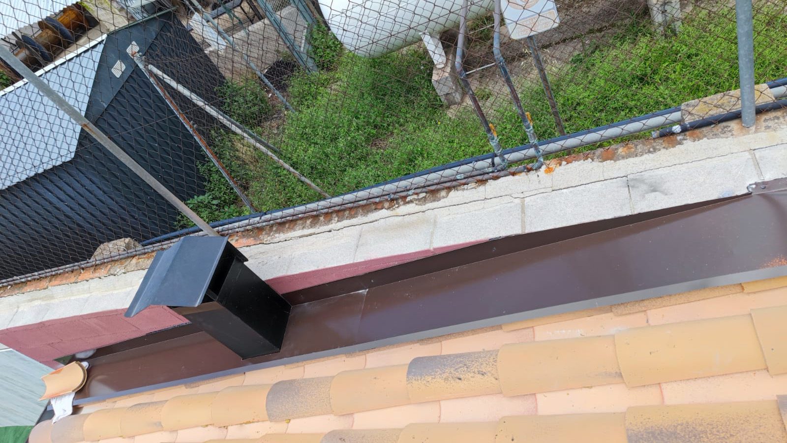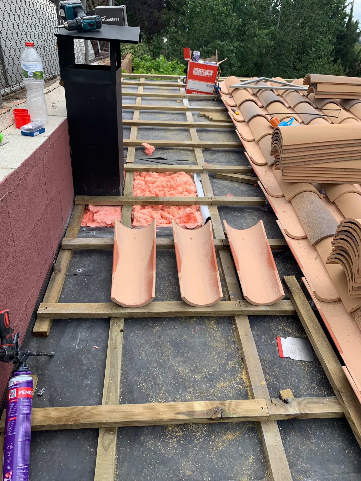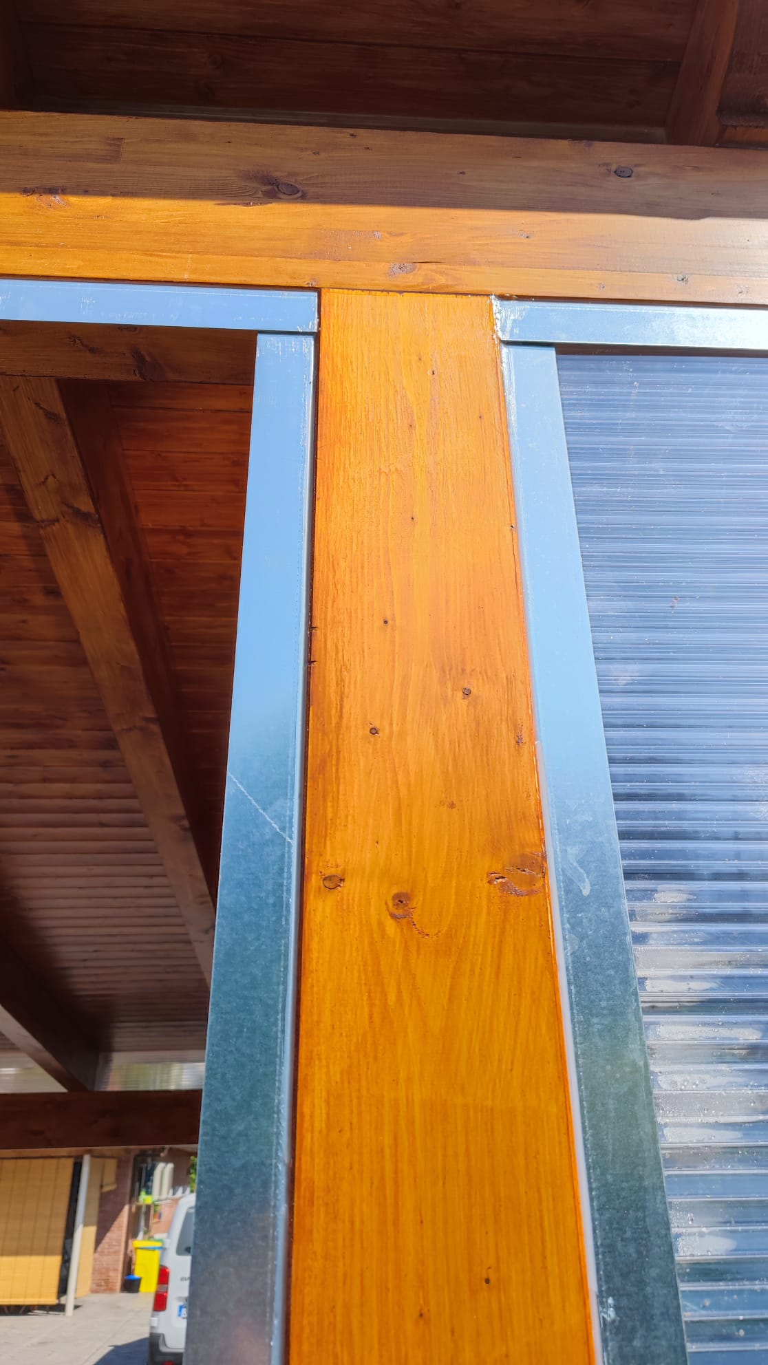 Nueva pérgola de madera en obra , para cierre de cocina exterior y barbacoa, compuesta por, estructura de madera portante, panel superior aislante, doble rastrel de madera, teja curva envejecida y cierre del conjunto con remates prelacados y canal. Se cerró también toda la parte trasera con policarbonato celular de 16mm y remates perimetrales, para resguardar del aire la estancia.